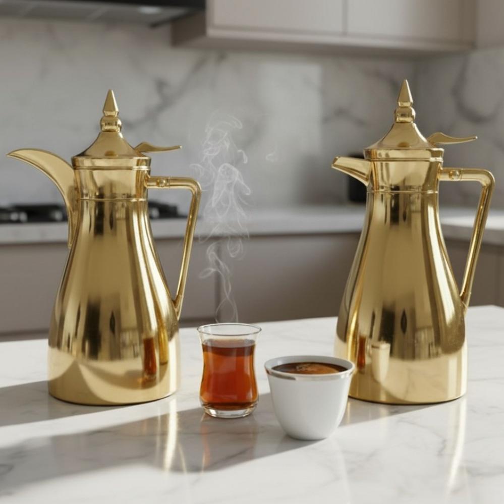- ترمس دله بتصميم ذهبي متناسق مع التراث مناسب لتقديم القهوة العربية والشاي بأسلوب أنيق، ويلبي ذوق الضيافة العربية الأصيلة، وهو المثالي لكل بيت.